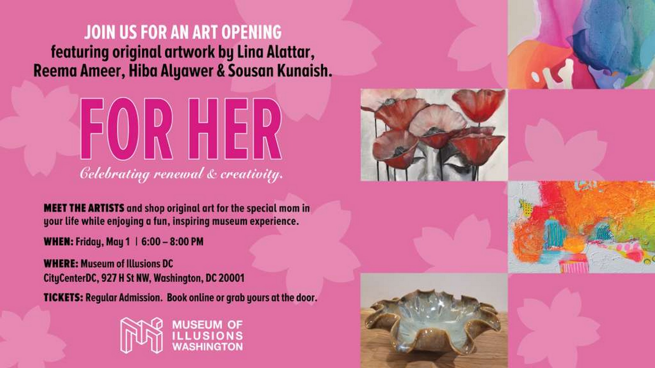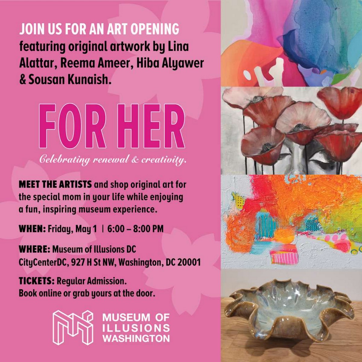 Join us for a special evening celebrating local art and creativity at the Museum of Illusions DC! This event marks the finale of Hiba Alyawer’s exhibition and features curated works by Lina Alattar, Hiba Alyawer, Reema Ameer, and Sousan Kunaish.